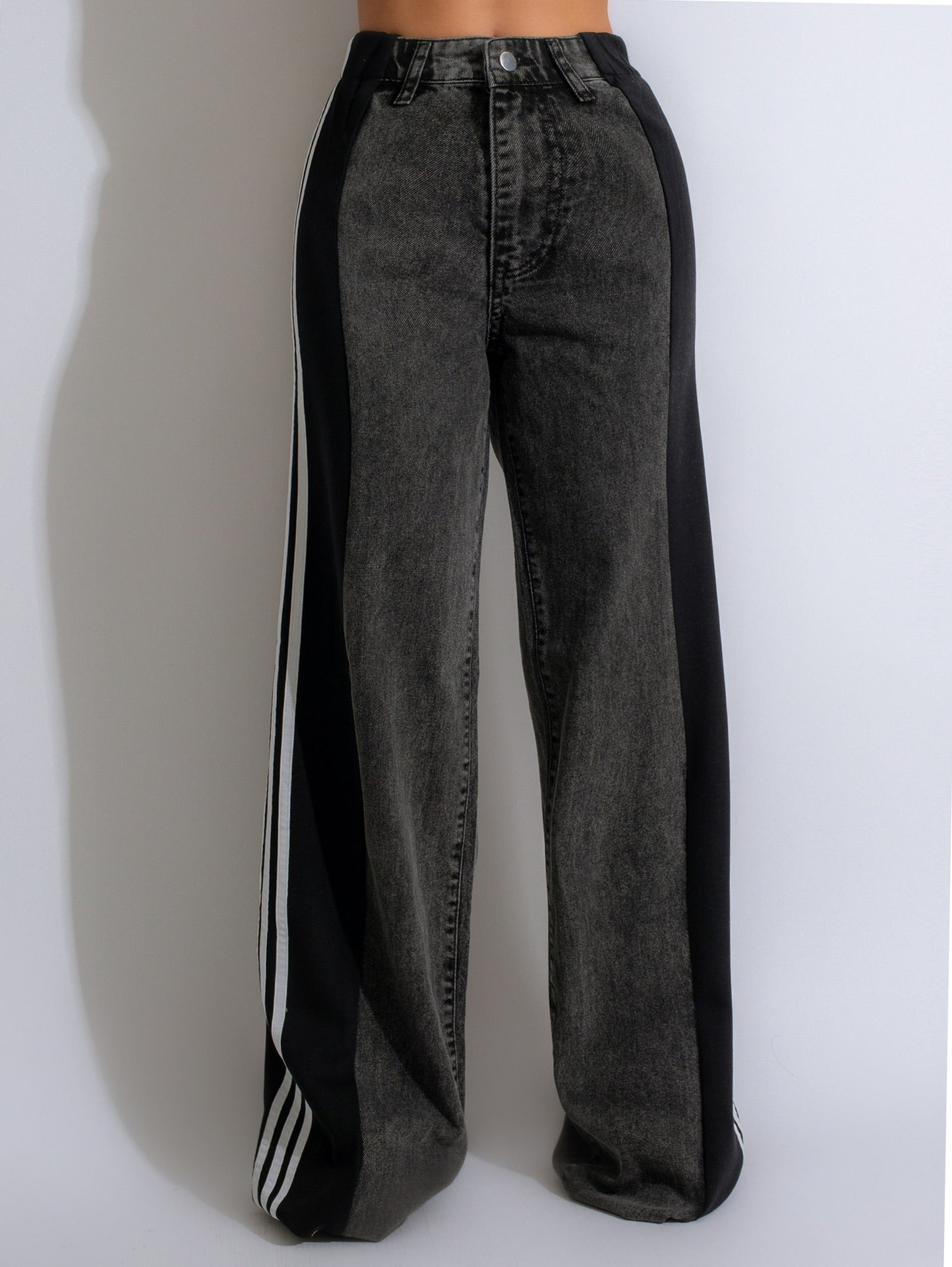 14 reviews for Fashion Casual High Waist Elastic Straight Leg Trousers Three Stripe Patchwork Denim Wide Leg Pants Streetwear