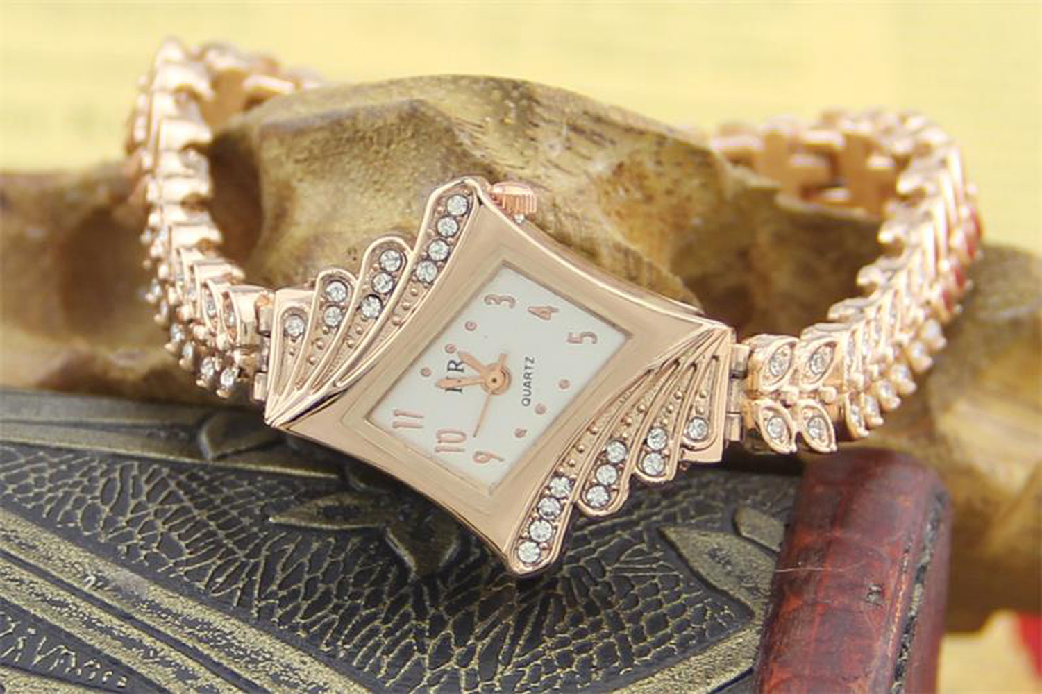 Stone Paved Wheat Shaped Metal Wristwatch for Women Rose Golden Color