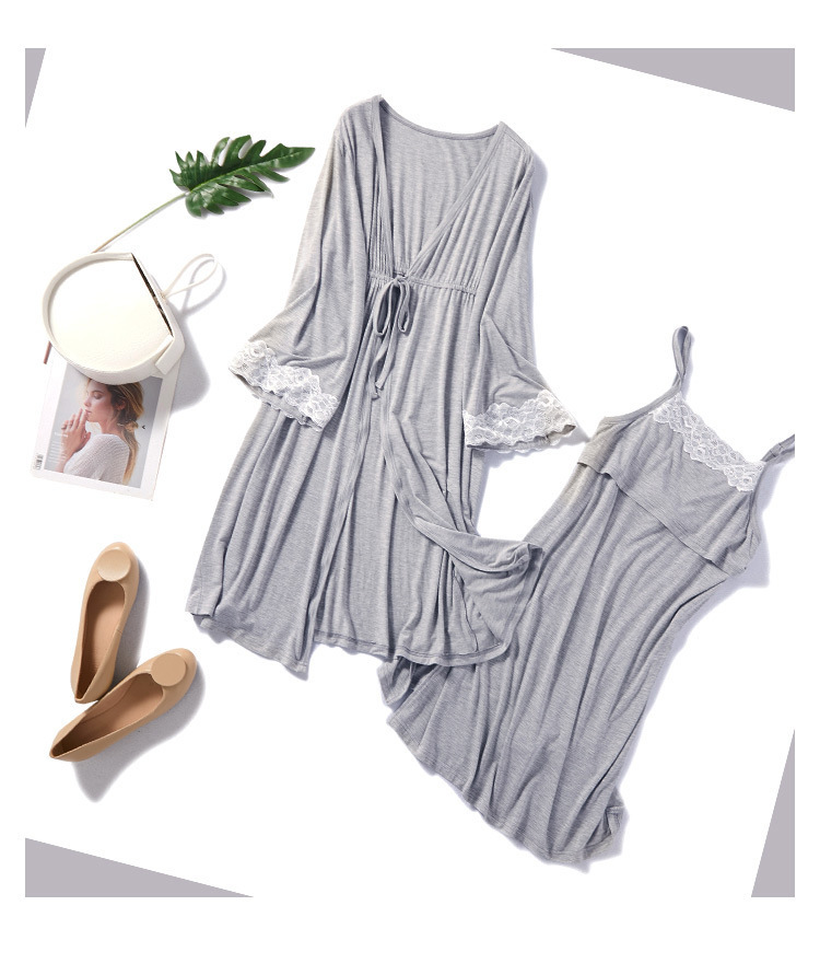 Excellent kit! The fabric is soft, pleasant to the body, awesome. I'm very happy! My Russian size is 46-48, height 160 cm, I ordered L. It turned out: the nightie is tight (the fabric stretches well), the robe on the abdomen and the chest is also tight, bottom abdomen freely. I would order for a bigger size for the nightie, so that I did not push my stomach so hard. The order came to Moscow very quickly, in 6 days.