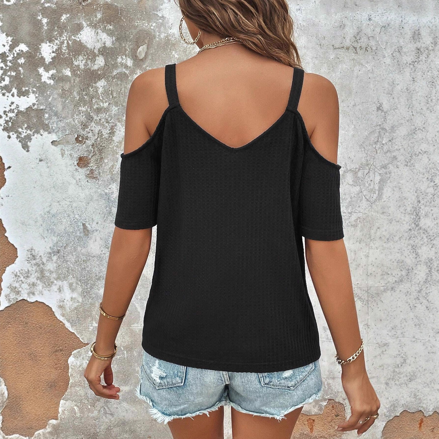 Be the first to review “V-neck Color-block Knitted Backless Loose Short-sleeve Camisole T-shirt Top”