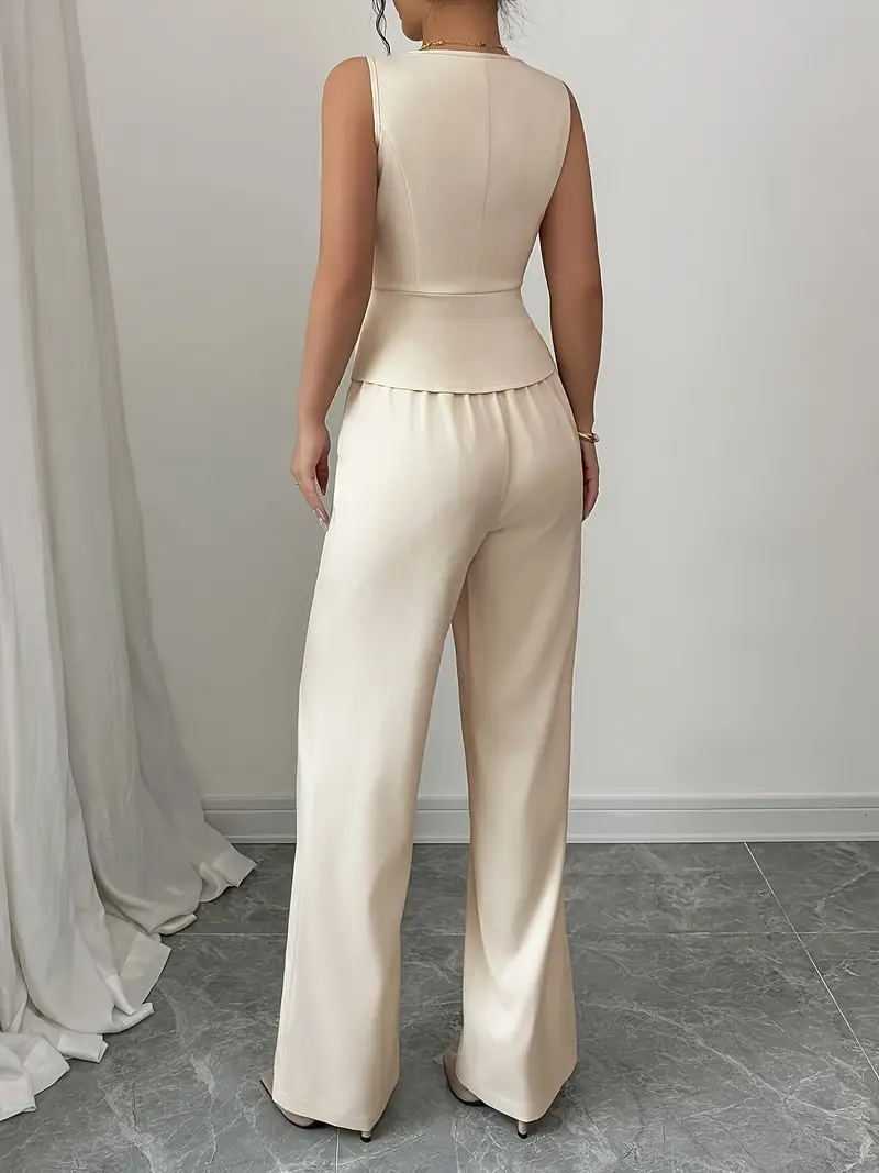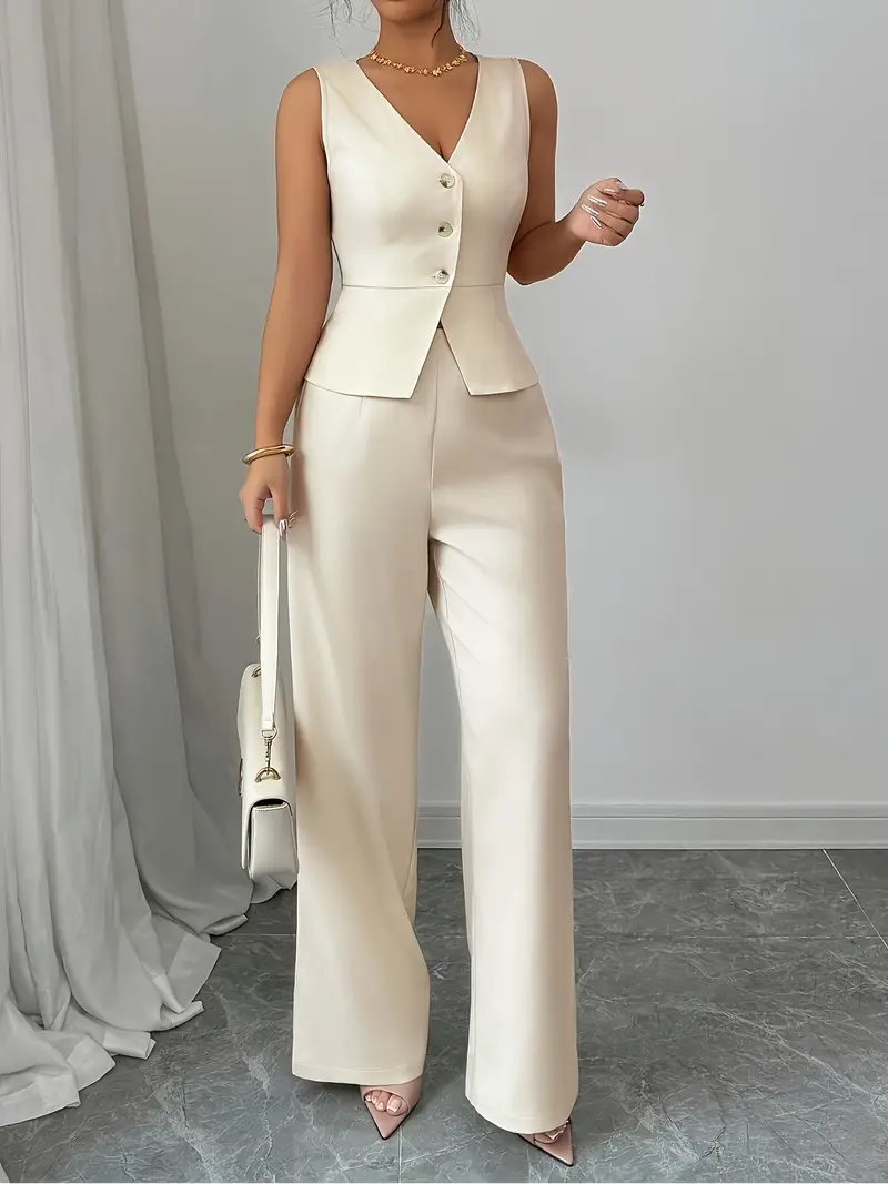مجموعة بلوزة وسروال نسائية أنيقة بدون أكمام - بلون بيج، بأزرار، بنطال واسع الخصر مع حقيبة مطابقة، مثالية للتنقل في العمل والمسابقات الصيفية، ملابس مكتبية|بلوزة أنيقة|كتفين محكمين، ملابس نسائية للعمل